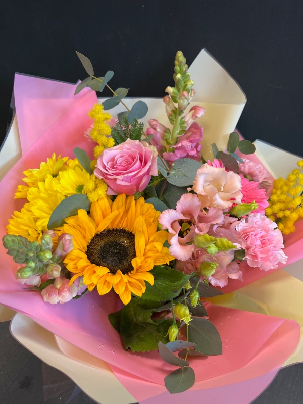 A gorgeous mixture of stems in yellows and soft pinks, arranged beautifully by our qualified florists with foliages throughout. This bouquet is the ideal Mother's Day gift. It brings spring and summer together.