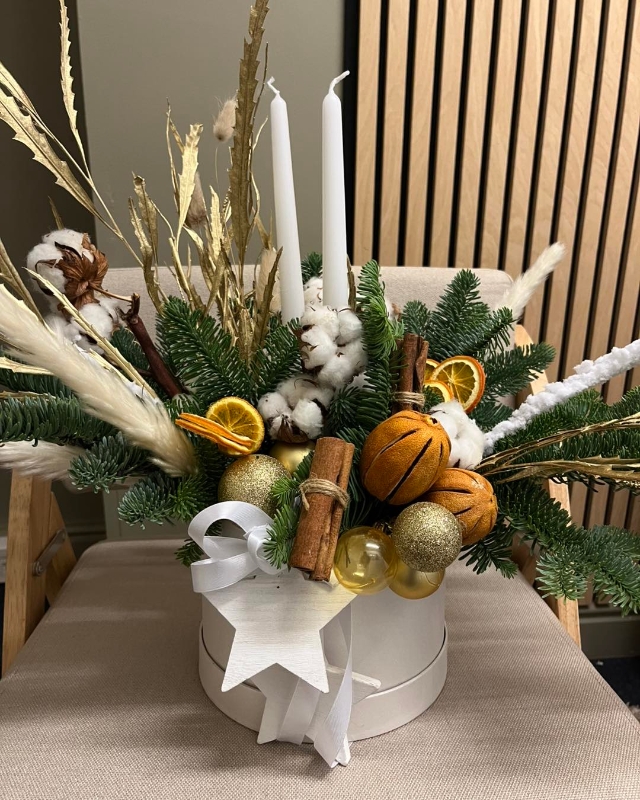 A truly scented hatbox arrangement, arranged perfectly by our qualified florists within an oasis foam & water. This design has festive foliages, spruce, cotton, dried oranges, cinnamon and golden touches with an elegant style.