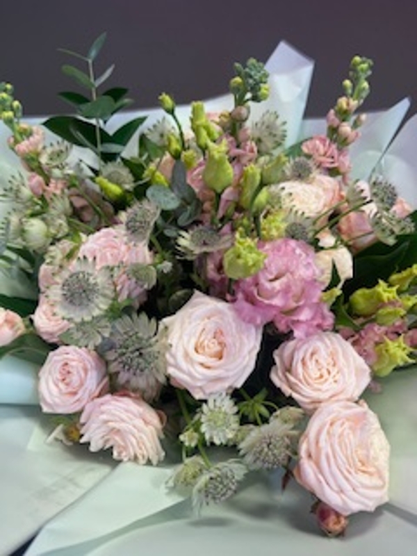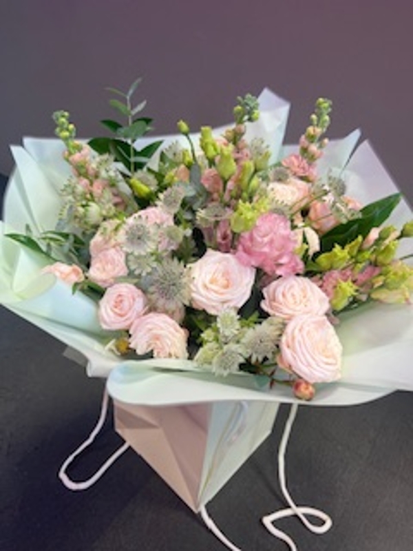 Pretty pink roses, surrounded by a selection of pale pink accent flowers, put together carefully by our qualified florists with seasonal foliage. Stems to be wrapped beautifully with layers of matching cellophane and encased in a bubble of water to ensure freshness. This handtied design is presented in an L.A. Florist gift bag.