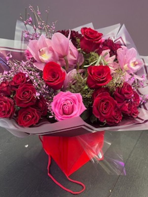 A stunning selection of red roses, cymbidium orchids and complimentary accent flowers chosen specially and arranged beautifully by our skilled florists. This handtied design ensures the flowers are presented in layers of cellophane & aqua packed for freshness complete with gift bag for presentation.